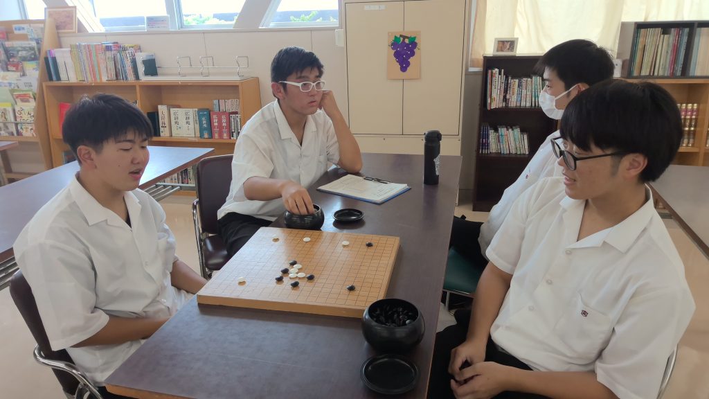 囲碁部が昭和47年に発足し、全国大会に出場するなど目覚ましい活躍をしてきたときもありましたが、部員数が減少した時期もあり、平成10年に囲碁・将棋部として再スタートしました。現在の活動は、授業後に週2回ほど部員同士の囲碁の対局をしています。大会にも参加して、目標としている段級位の認定を受ける生徒も多く、成果を上げています。棋力向上を目指して活動しています。